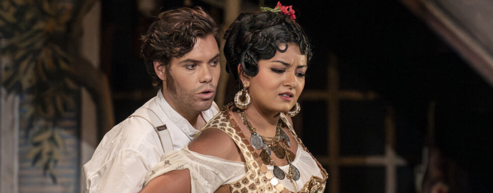 C’est Ben Glassberg qui est ici dans la fosse avec sur scène la formidable et sensuelle Carmen de Deepa Johnny, jeune mezzo-soprano canadienne d’origine omanaise qui a fait sensation vendredi à l’occasion de la première.