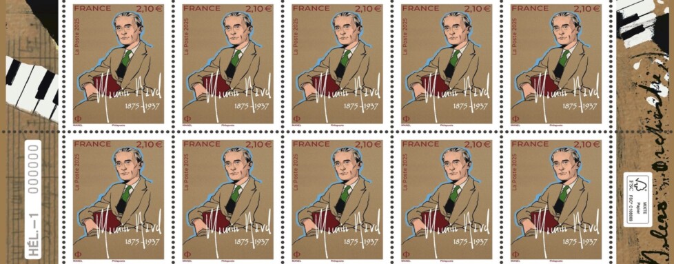 Après un premier timbre émis en 1956 La Poste émet en premier jour le 7 mars 2025 un timbre en hommage à Maurice Ravel à l’occasion du 150e anniversaire de sa naissance.