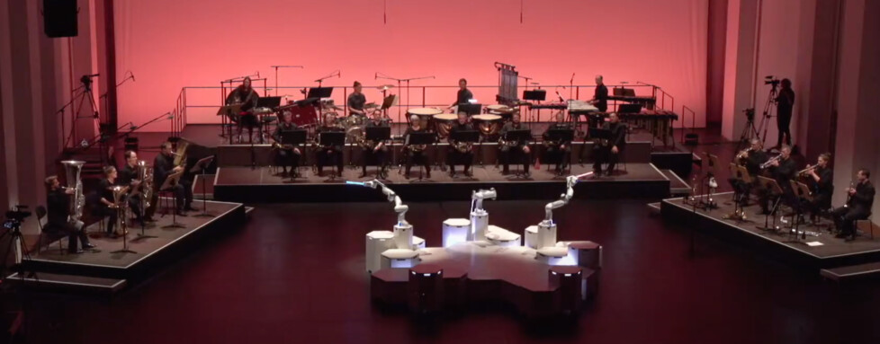 Deux des bras du robot ont également guidé les musiciens lors de la première de #kreuzknoten de Wieland Reissmann, un autre morceau impliquant des instruments joués simultanément à différents tempos.