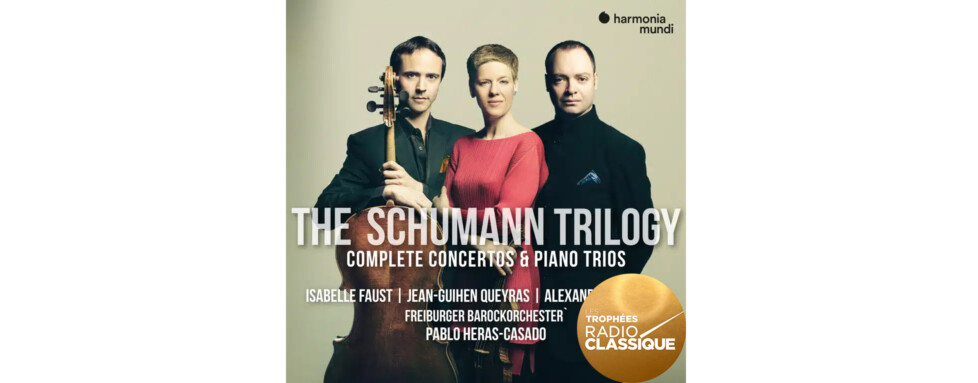 « The Schumann Trilogy »– Complete Concertos & Piano Trios. Isabelle Faust (violon), Alexander Melnikov (piano), Jean-Guihen Queyras (violoncelle), Orchestre baroque de Fribourg, dir. Pablo Heras-Casado (4 CD Harmonia Mundi)